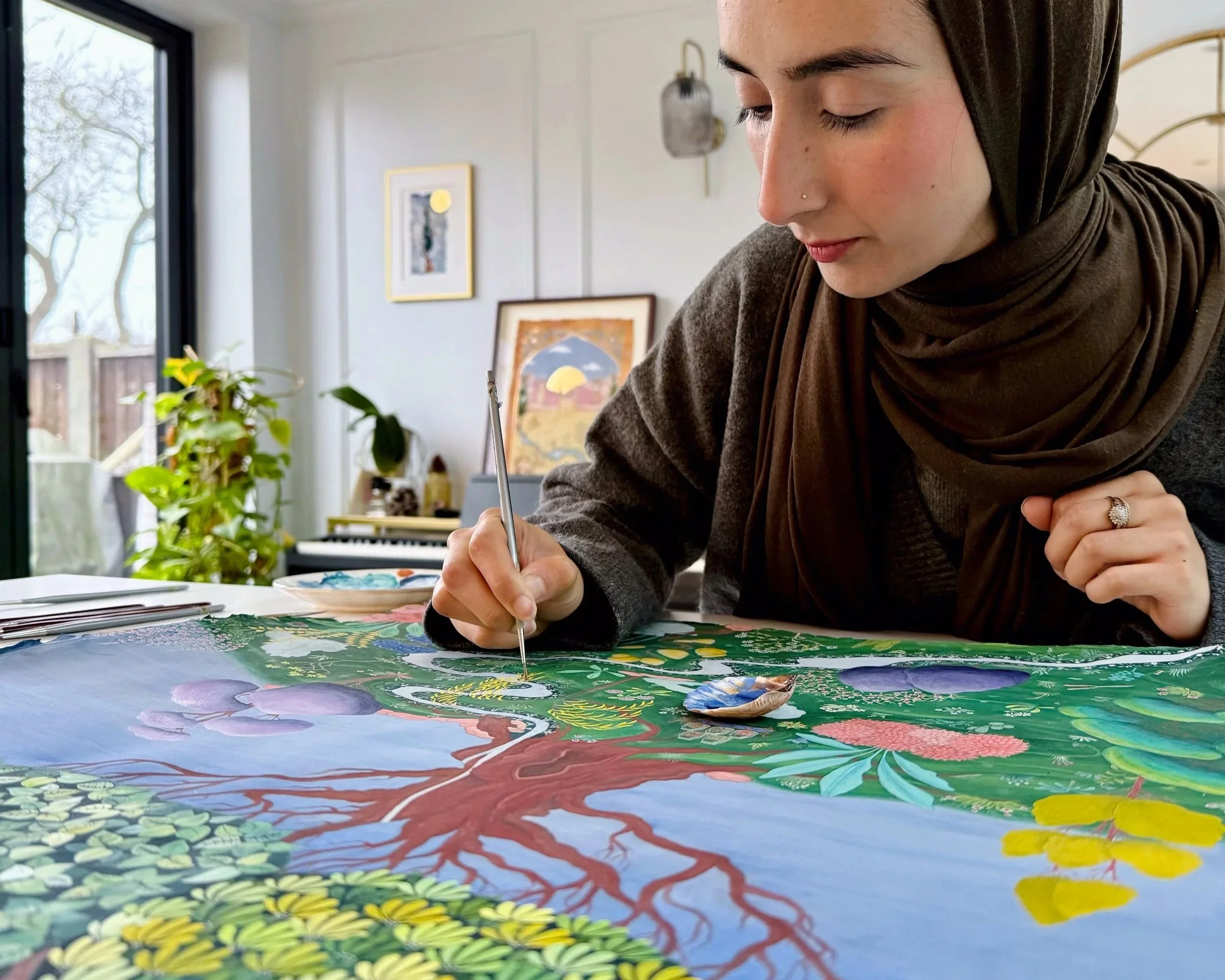 Mobeen Akhtar is a self-taught British Pakistani artist whose practice traces a parallel journey of spiritual, cultural, and environmental reflection. Working with traditional miniature techniques, she seeks a deeper connection with the Divine while exploring her identity as a British-born woman of the diaspora. Her work grows from a place of quiet contemplation and unfolds through a slow, meditative process that enables her to examine different facets of human existence, including spirituality, ethics, moral inquiry, and the physical mark we leave on the Earth. Her inquiry extends into the unseen, recognising that the energies created through human action move beyond the tangible world and leave an imprint on the metaphysical realm, the unseen space in which the soul resides.